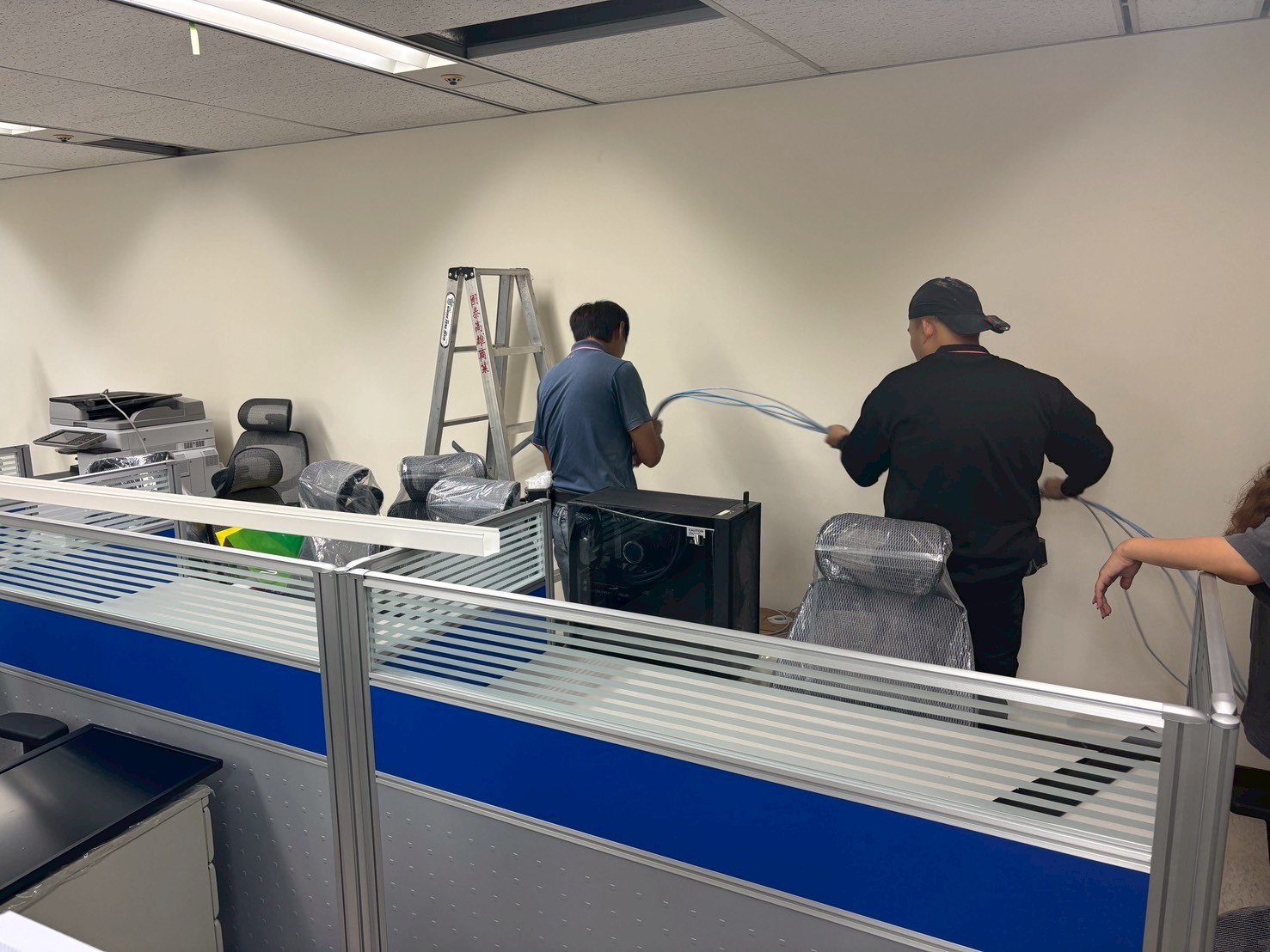 辦公室網路建置服務介紹本次辦公室弱電工程案例,建置穩定且高效的網路環境,包含以下施工與配置: 1. 機櫃與網路核心設備安裝<採用專業弱電機櫃,集中安置網路交換器(Switch)、路由器、配線架(Patch Panel)等核心設備,確保設備管理有序、安全且散熱良好。線纜均依本公司佈線規範施作標籤,以利維護查修。機櫃下方配置UPS不斷電系統,避免停電影響網路服務,確保重要系統不中斷運行。 2. 網路線佈線與整理使用高品質網路線(Cat6/Cat6a),符合高速傳輸需求。採用壁槽線槽進行走線,外觀整齊,減少裸露與磨損。網路線兩端均經專業壓接與測試,確保訊號穩定。 3. 辦公區及會議室資訊與電源插座安裝在辦公隔間牆面設置網路資訊面板與電源插座,方便員工接入網路與設備供電。配線距離與路徑規劃經過事前測量,確保最短距離、最少彎折,降低訊號衰減。 4. 系統測試與驗收所有網路端口均經專業測速與Ping測試,確保穩定連線與低延遲。完成設備標籤與編碼,方便後續維護與擴充。
