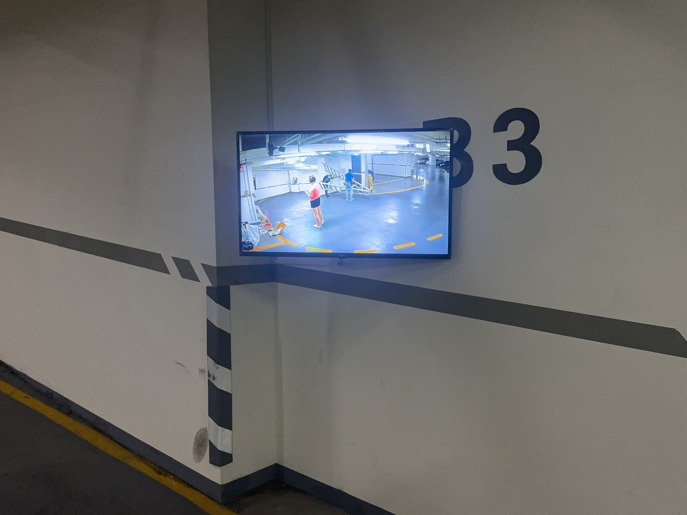 現今集合式住宅林立,大樓地下停車場所面臨的問題便是高車流卻多死角,為了提升地下停車場車道轉彎處的行車安全,本建案管理委員會委託我們設計與施工一套即時影像顯示系統。 由於地下停車場的死角多、車流量大,駕駛人在出入轉彎時容易因視線受阻而發生碰撞,因此透過即時監視畫面的呈現,可有效降低意外風險。 本案較為特殊的便是車道位於樓層中間,左右均有規劃停車格,但車道口兩側柱體卻會很大程度的阻擋駕駛人視線,導致上下行車輛非常容易於斜坡車道會車。 規劃改善方式:於上下行車道口增設監視器鏡頭,並將畫面轉送至對向車道口。 部分無線槽位置以顏色相近之壓條藏線,垂直線路則以弱電暗管穿線下樓。 電視安裝位置均選於進入車道前駕駛人習慣目視的路徑之上,故便能於進入車道前提前確認有無車輛。